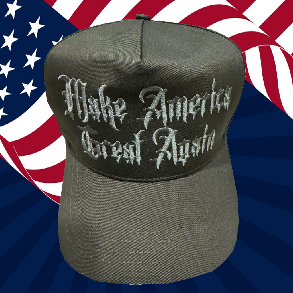 Gothic Embroidery: Intricate gothic embroidery adorns the front, featuring the iconic “MAGA” slogan in a striking black font.